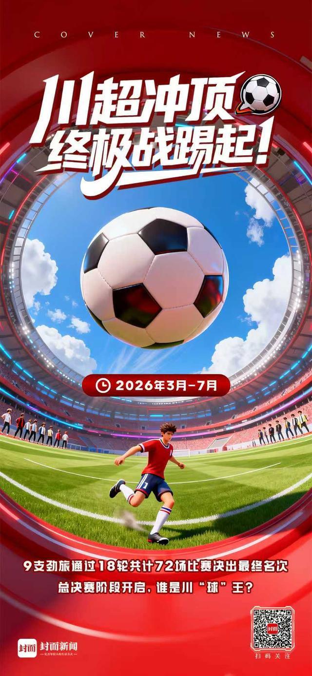 3月13日晚,2025-2026赛季四川省城市足球联赛(川超)重燃战火,开启总决赛阶段角逐。从3月的初春到7月的盛夏,从小组赛突围晋级的9支球队将在接下来的近4个月的时间里,进行18轮72场激战。