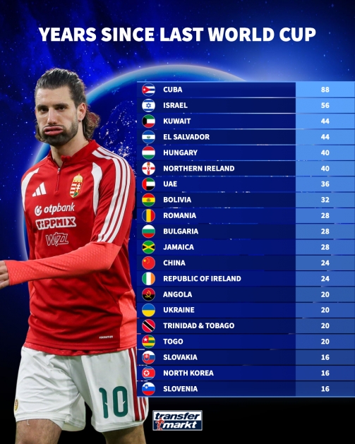 距上次参加世界杯时间最久的是古巴,他们已等待了88年之久。第二的则是以色列,他们上一次参加世界杯要追溯到1970年。