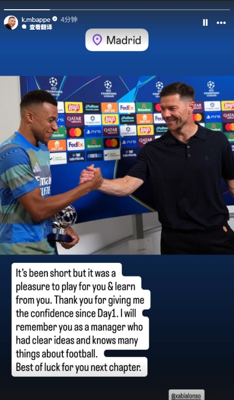 皇马官宣阿隆索下课,姆巴佩在社媒发表动态与阿隆索告别。