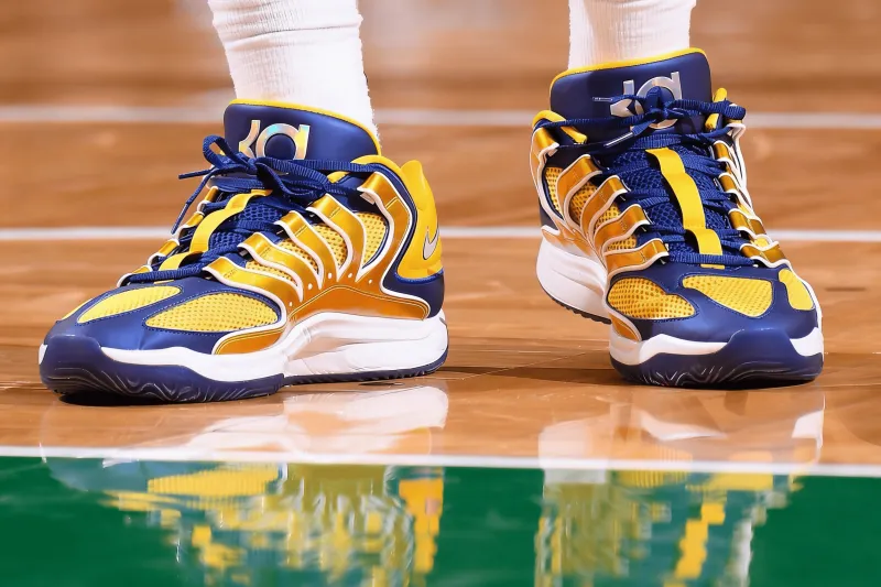 比赛中,西亚卡姆上脚蓝金色Nike KD18 PE。